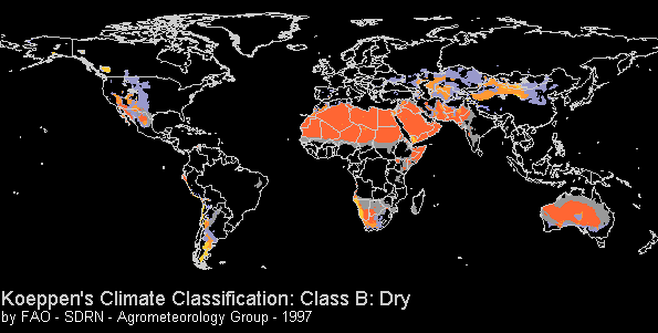 Τα χρώματα αντιστοιχούν σε τύπους κυρίαρχης βλάστησης. Ζώνες σε γκρι και μπλε έχουν κλίμα στέπας, ενώ σε πορτοκαλί χρώμα είναι έρημοι. Ζώνες σε κίτρινο (π.χ. οι ακτές της Namibia) είναι ερημικές περιοχές με δροσερό, ξηρό κλίμα; η θερμοκρασία του θερμότερου μήνα δεν ξεπερνά τους 18°C.
